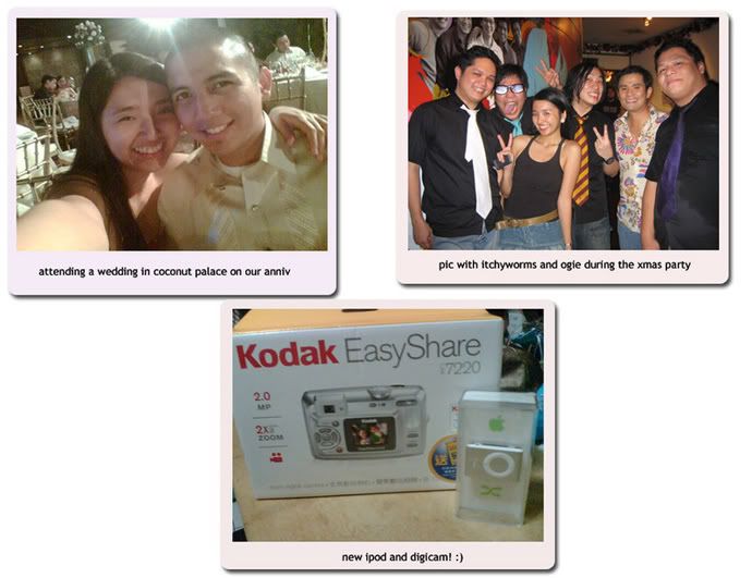 I can feel Christmas already! :) I love playing the song "All You Need Is Love" from Love Actually soundtrack, I think that's the best feel good Christmas movie. I'm such in a super happy-good-mood lately. Well for one, Ian's back! I guess I can account that as the primary reason haha ;) The next one, I'm almost done with my Christmas shopping, I think I'm down to less than 10 people in my list. I loooove shopping for gifts and putting time and effort wrapping them. In addition to these, I got an ipod and digicam for free! Wow. All in one day. The ipod was a gift to all employees in our office. Can you imagine that, ALL employees get 1gb ipod shuffle as gift by the owners/boss of the company. Merry Christmas to everyone! Haha. The digicam, I got it during registration for the company christmas party in Tavern, GB3, you pick a paper in a bowl, and tadaaah instant digicam. And of course, in the spirit of Christmas, I didn't hoard these things for myself. I already have an ipod, and I've always wanted to give one to my brother so I gave it to him. For the cam, I already have one too, so I sold it at a really cheap price to my cousin. Plus what kicked off my Christmas mode, our office Christmas party! There were bands like Itchyworms, Hale, Imago, even Ogie Alcasid sang. Tavern was closed for the night for our party :) I thought it was too early to be having a Christmas party, but it was just right to set everyone in the festive mood :) And last but not the least, we won our Christmas party presentation, I mean my team won! We shot a video in Bora, had a live performance, and won P10k, which we used to buy gifts for the rest of the teams in the office. So there, in case I won't be able to write another entry soon, advance Merry Christmas to everyone! :)
